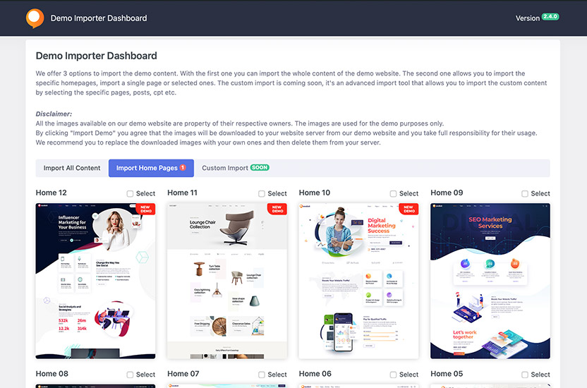 The theme has a new feature “Smart Demo Import”. At the moment we offer 3 options to import the demo content. With the first one you can import the whole content of the demo website. The second one allows you to import the specific homepages. The custom import is available now.